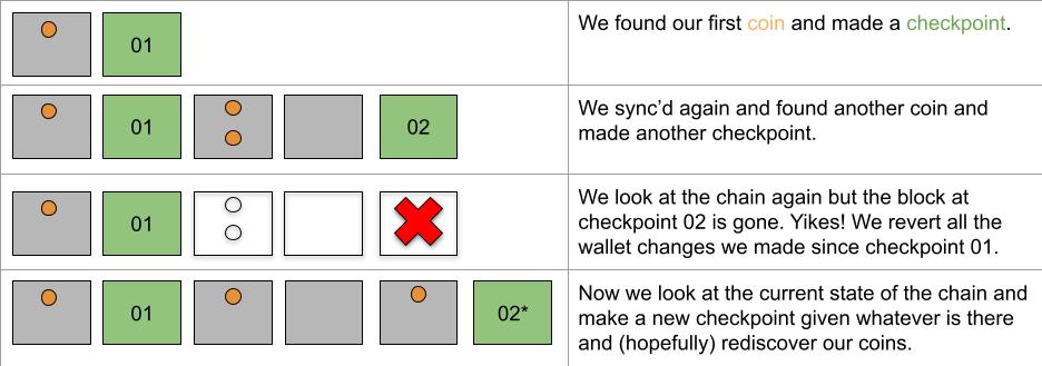 With bdk_core I want to introduce the concept of a checkpoint, which is a block height and hash and a set of txids that were present at that height but not present in the previous checkpoint. In this way we create an append-only data structure that can easily be rolled back to a previous height if there is a reorg. After rolling back we can then roll forward and apply the new blocks.