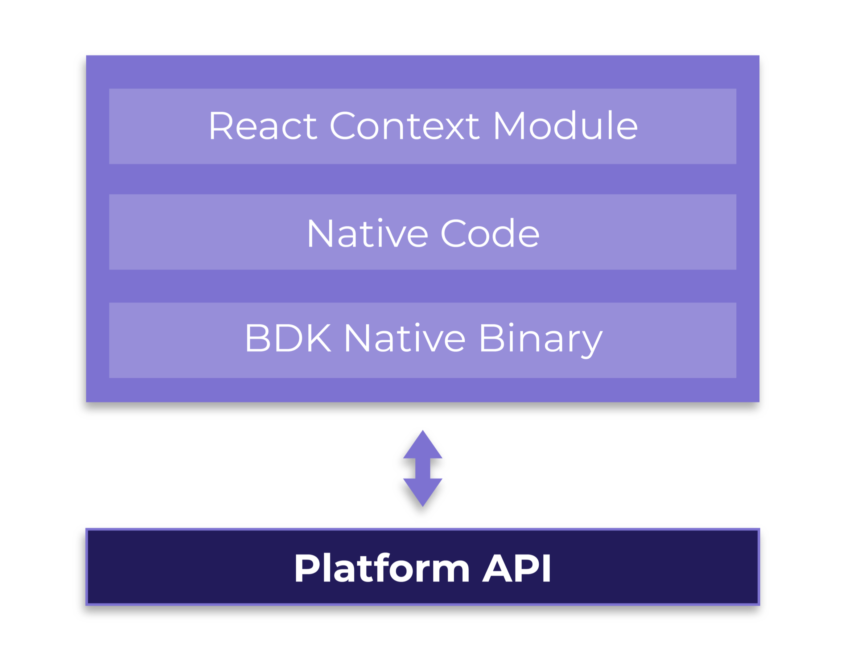 bdk-rn uses React Context API plus some native code to wrap and enhance bdk-kotlin and bdk-swift APIs. The native code calls and interacts with the Android and iOS native modules which interface with the underlying mobile platform.
